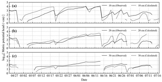 Matric potential head in the calibration plot in 2019. (a–c) Results at depths of 10, 20, and 30 cm, respectively. Those results were converted from observed and calculated volumetric water content by using calibrated Mualem–van Genuchten parameters (Table 5). We excluded data that showed positive values.