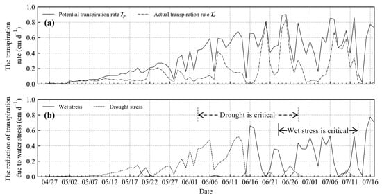 Potential and actual transpiration rates and water stress under actual conditions in 2019. (a) Transpiration rates; (b) water stress. The critical growth periods for drought and wet stresses were defined based on Çakir [] and Kanwar et al. [].