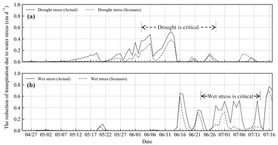 Separate evaluations of drought and wet stresses are likely to be necessary when determining appropriate adaptation measures. Figure 8b shows the drought and wet stresses separately, highlighting the critical growth periods for drought and wet stresses [,]. As shown in Figure 4a and Figure 8b, little rain fell until 15 June 2019, and drought stress increased during this period. The maximum drought stress level occurred on 13 June 2019. Wet stress predominated after 15 June 2019, when precipitation was more frequent. Moreover, the highest groundwater levels appeared on 16 June, 12 July, and 15 July 2019, which could have induced wet stress. The two highest levels of wet stress occurred on 16 June and 16 July 2019. Figure 8b indicates that under the actual conditions, drought and wet stresses appeared between 3 and 13 June 2019 (40–50 days after emergence) and between 23 June and 13 July 2019 (60–80 days after emergence), respectively. This implies that the actual conditions were disadvantageous for maize growth in terms of water stress. We note that the second largest peak of wet stress on 16 June 2019 may affect crop growth adversely even the stress occurred in the critical period for drought stress (Figure 8b).