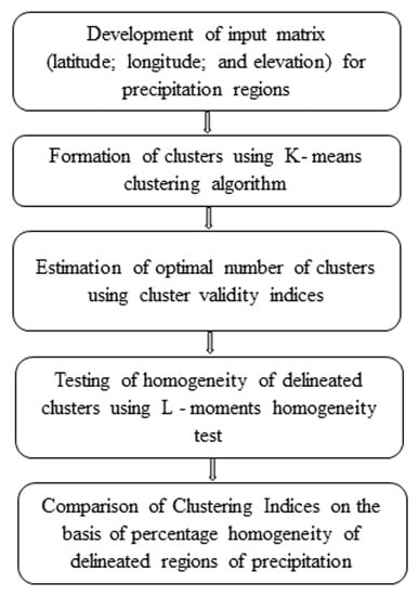 Efficient clustering algorithms aim at identifying homogeneous precipitation regions and discarding the irregularities present in the data distribution. In this section the three main steps are presented: (i) delineation of regions using k-means clustering, (ii) cluster validity indices (CVI), and (iii) validation of regions for homogeneity using L-moments ratio test, involved in the regionalization of precipitation zones. The framework for the delineation of precipitation regions is presented in Figure 1.
