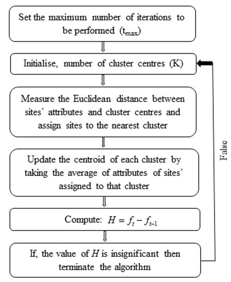 Clusters can be identified in a given set of data by determining a local minima solution through an iterative procedure, as McQueen [] illustrated. This commonly used procedure is known as k-means clustering algorithm. This algorithm positions k centers amongst the data set and then assign the sites to its nearest center []. Those attributes having higher value have a more significant effect on the subsequent delineated clusters by k-means algorithm []. Therefore, the attributes are re-scaled to reduce the effect of their variances and relative magnitudes using,