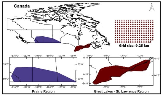 Location map of the climatic regions of Canada—Prairie region and Great Lakes-St Lawrence lowlands region. The grid map represents the size of the ANUSPLIN gridded data.