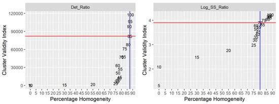 An illustrative example of the performance of two CVIs (Det-ratio and Log-SS-Ratio) is presented in Figure 4. The comparison is based on the percentage homogeneity, number of clusters and the CVI’s selection criteria. The Figure 4 describe: (i) CVI values (on y-axis); (ii) percentage homogeneity (on x-axis); (iii) the numerical in the panel indicate number of clusters resulting in the pair of CVI value and percentage homogeneity; (iv) horizontal y-intercept red line represents CVI’s ideal value based on the selection criteria presented in Table A1; (v) vertical x-intercept blue line represents the value of percentage homogeneity with respect to the CVI’s ideal value in (iv). In Figure 4, the CVI value, number of clusters, and percentage homogeneity corresponding to the CVI’s ideal value (red lines) are (82003, 85, 87.5%) and (3.900, 70, 80%) for Det-Ratio and Log-SS-Ratio, respectively. The selection of CVI is based on the higher value of percentage homogeneity among the CVIs. In case, if the CVIs have similar/equal percentage homogeneity, then the CVI with the lower number of clusters is selected. In the example illustrated, it is evident that the Det-Ratio is able to obtain a higher value of percentage homogeneity (87.5%) when compared to Log-SS-Ratio which is (72%) and hence the Det-Ratio based CVI is selected. Similarly, the relative performance of several CVIs can be assessed based on the above selection procedure.