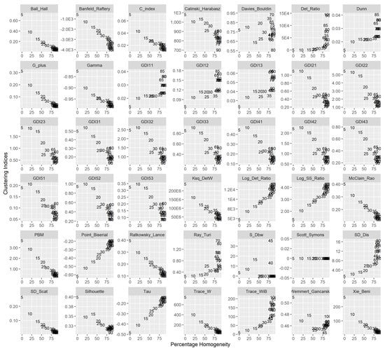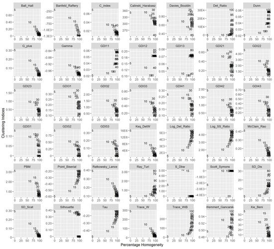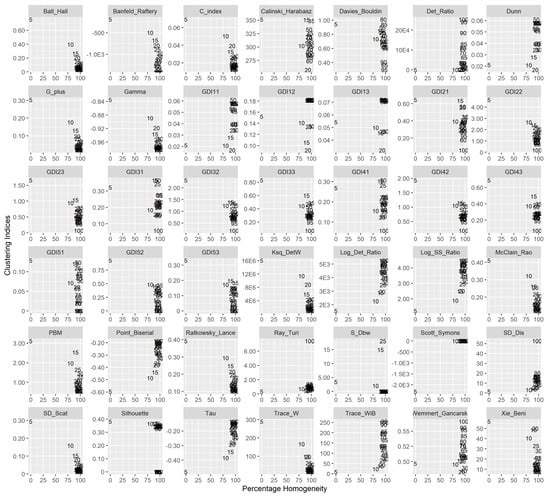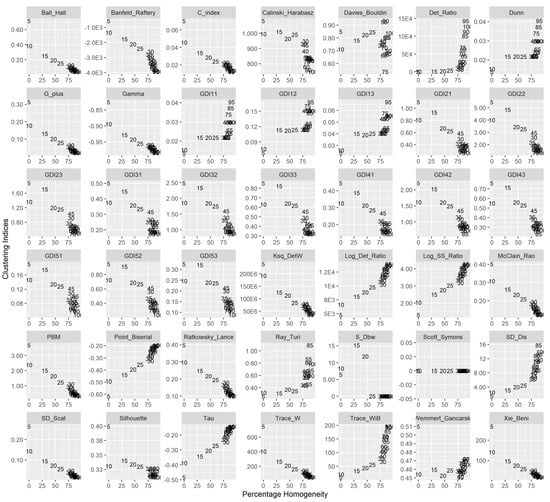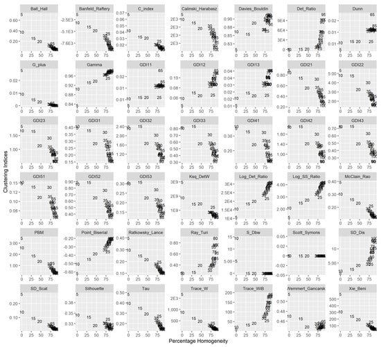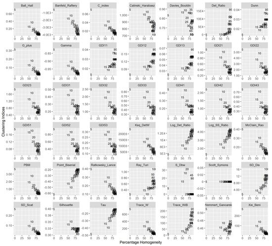 The 10810 sites of Prairie region were regionalized into 27 clusters using the empirical formula, thus giving the percentage homogeneity in, (i) Winter season—81%, (ii) Spring season—78%, (iii) Summer season—78%, and (iv) Autumn season—76%. The variation of percentage of homogeneity for each CVI and the number of clusters are presented in Figure 5, Figure 6, Figure 7 and Figure 8. The coordinates of the same are marked with the number of clusters which divided the region. Out of 42 CVIs, 14 of them outperform in comparison to empirical formula in all the seasons. The selected 14 indices along with the best number of clusters and their corresponding percentage homogeneity are listed in Table 1. The maximum percentage homogeneity determined for each season is: