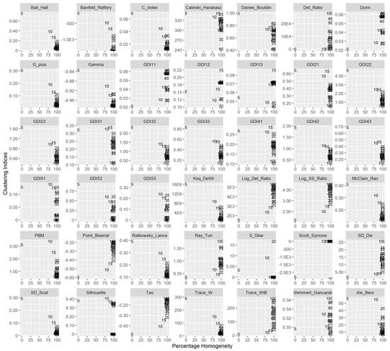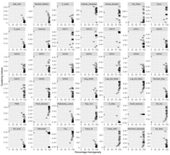 - 100 clusters for Banfeld–Raftery index, G+ index, Point–Biserial index, SD [Scat] index, Tau index and Xie–Beni index.