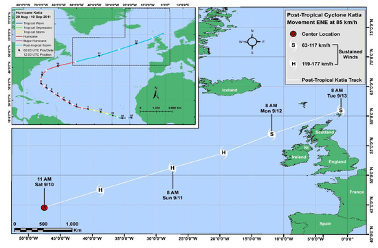 Hurricane Katia’s formation was instigated by a wide low-pressure system on the 28th of August 2011, offshore of the western coast of Africa (Figure 1). The low pressure system moved westward and, on 29 August, acquired sufficient convective intensity to be designated as a tropical depression when it was located about 695 km southwest of the south westernmost Cape Verde Islands (https://www.nhc.noaa.gov, accessed on 18 April 2020). The depression moved to the west-northwest for the next 24 h and gradually strengthened, becoming a tropical storm on 30 August about 787 km southwest of the Cape Verde Islands. The cyclone maintained a west-northwest trajectory at around 27.8 km h−1 for the next two days and steadily strengthened to reach hurricane intensity on the Saffir-Simpson Hurricane Wind Scale by 1 September when it was located about 2176 km east of the Leeward Islands. After achieving hurricane status, Katia turned northwest and continued to strengthen and reached hurricane category 4 status on 5 September with wind peak intensity of 220 km h−1 and a central low pressure of 942 mb when the hurricane was located about 870 km south of Bermuda. Such extreme conditions lasted one day only and the hurricane then slowed down and gradually turned north-east on 9 September (Figure 1). After this, the wind field expanded and weakened. When Katia was located about 650 km northwest of Bermuda, it turned toward the east-northeast and increased in speed, to approximately 92 km h−1, arriving over the cold sea-surface temperatures (22 °C) of the North Atlantic Ocean. The combination of cold water and strong vertical wind shear favoured the quick transition from a hurricane status into a powerful post-tropical low-pressure system by 1200 UTC 10 September when it was located about 463 km south-southeast of Cape Race, Newfoundland. On 11 September, Katia cyclone, a large and powerful post-tropical storm, turned north-east towards the northern British Isles with an average velocity of 85 km h−1. The post-tropical cyclone reached the northern coast of Scotland on 12 September and produced sustained gale-force winds across most of the British Isles and hurricane-force wind gusts in Scotland, Northern Ireland, and northern England with average wind speed from 101 to 188 km h−1 with peak values of 212 km h−1 recorded in North Wales. On the 13 September the cyclone continued north-eastward and dissipated over the North Sea. In Europe, the post-tropical cyclone Katia impacted numerous locations, downing trees, bringing down power lines, and leaving thousands without electricity. In the United Kingdom the storm was responsible for two deaths and caused approximately £100 m ($157 million 2011 USD) in damage [1].