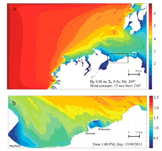 Storm waves generated by the Katia post-tropical cyclone lasted until the 15 September, two days after the cyclone dissipated. Significant wave heights ranged from 1 to 3 m in the nearshore region, while offshore the wave buoys recorded values in excess of 5 m at the peak of the storm on 13 September 2011. Significant wave attenuation across the wide and irregular shelf and shoreface of Northern Ireland is evident from the exposed open ocean locations of the buoys to the relatively sheltered north coast area (Figure 2 and Figure 3a,b). Considering in higher detail the variability within the north coast high resolution grid (Figure 3b), it is observed that wave heights also change significantly between the western, more protected area, towards the eastern more exposed one. Water levels recorded during the storm at Portrush’s tidal gauge and modelled wave characteristics in each investigated site are presented in Figure 4. Maximum water levels were recorded on the 13 September 2011 (Figure 4a), with a storm surge effect ranging between 0.2 and 0.5 m induced by the low atmospheric pressure during the passage of the storm on the 13 September. Nearshore wave heights, even during the most energetic period of the storm, recorded between the 13 and 14 September and shown in Figure 3 and Figure 4b, are relatively low, ranging from around 0.8 m in Magilligan to around 1.6 m in Portrush.