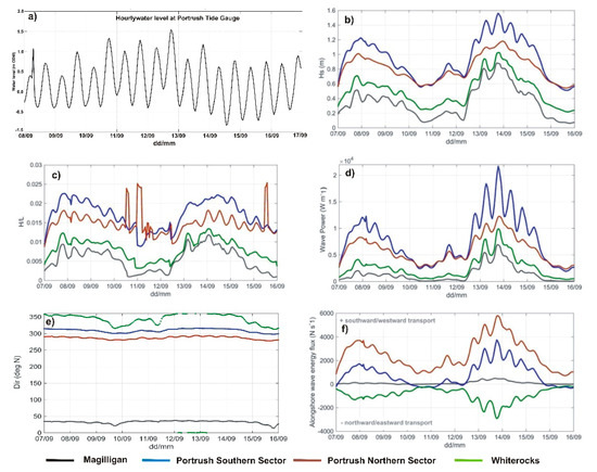 Water levels (a) at the Portrush tide gauge were reported as values above Ordnance Datum Malin (equivalent to Mean Sea Level). Wave height (b), wave steepness (c), wave power (d), wave direction (e) and alongshore wave energy flux (f) at different investigated sites.