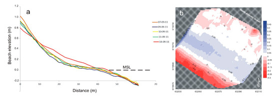 During the 7–10 September 2011, the beach showed limited elevation changes (on the order of 5–10 cm), which were largely uniform along both the cross-shore, i.e., along the dry beach and the foreshore and the longshore direction (Figure 5a). Volumetric variation indicates some general beach erosion (Table 2). The survey carried out on the 14th, i.e., after the most energetic waves impacted the beach (Figure 4b,d), showed longshore uniform erosion in the dry beach, with vertical erosion of ca. 10 cm, and an equivalent accretion at the central part of the beach according to a beach pivoting mechanism. Volumetric changes reflected a general, very small, accretion (Figure 5b, Table 2), with an alongshore uniform pattern consistent with the shore normal waves that impacted this beach during the storm (Figure 4e,f).