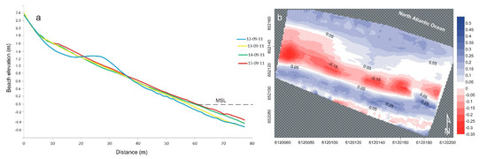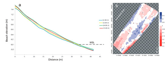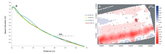Prior to the storm, the beach presented a well-developed berm, ca. 30–40 cm in height (Figure 8a). During the first stages of the storm, on the 13 September, relevant morphological changes took place linked to the erosion of the berm and the landward and seaward transport of the eroded sand according to a process of beach flattening—but no net erosion was recorded (Table 2), this indicating a supply of sediments from the western part of Curran strand driven by eastward alongshore wave energy fluxes under low energy westerly approaching waves (Figure 4e,f). No relevant morphological changes took place in following days and accretion was recorded along all the profile (Figure 8a and Table 2). Overall, at the end of the storm, the beach recorded a volumetric accretion of 632.2 m3 visible on the dry beach and at the lower foreshore (Figure 8b).
