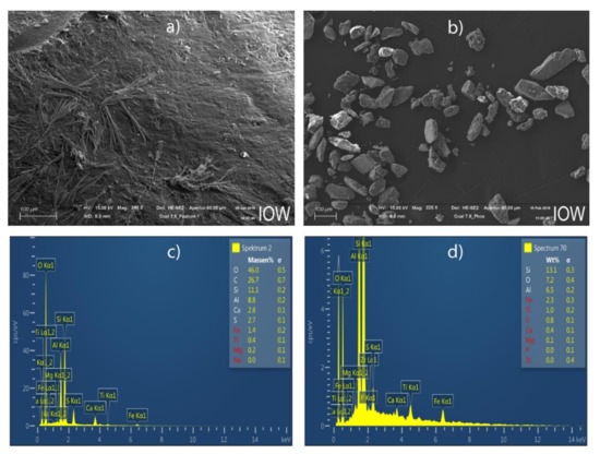 The energy dispersive X-ray (EDX) and the scanning electron microscope (SEM) images and elemental spectra of the adsorbent were described both before and after adsorption respectively (Figure 1). The SEM images of the adsorbent revealed that the leftover coal has a spherical shape and heterogeneous cross-sectional surfaces (Figure 1a,b). The EDX analysis showed the elemental composition and spectral peaks of the adsorbent. Figure 1c,d revealed that the peak with contents of carbon(C), silica (Si), aluminum (Al), sulfur (S), calcium (Ca) and iron (Fe) all at K-alpha signals. As expected, the leftover coal contains high amounts of SiO2, Al2O3 and organic materials. The p was observed after adsorption at the peak position of 1.98 keV as K-alpha signal (Figure 1d), from which we conclude that leftover coal material is suitable for phosphate removal.