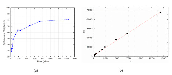 Kinetic of phosphate adsorption process: (a) Effect of contact time on phosphate removal and (b) linear regression of t/q vs. time (pseudo second-order).
