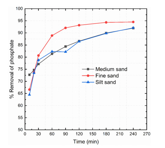 The effect of particle size on the adsorption of phosphate was investigated with three different particle sizes. The particle sizes of the material were categorized as silt sand (less than 0.075 mm), fine sand (0.075 mm to 0.425 mm) and medium sand (0.425–2 mm). As can be seen from Figure 3, the percent of phosphate removed by the fine sand fraction was higher (94.5%) than that of the silt and medium sand of the adsorbent (91.8% and 92.1%) after 240 min reaction time. At an earlier stage of the experiment (after 90 min) differences were slightly more pronounced. The results showed that the particle size as investigated here has only minor effects on the adsorption capacity, which is only partially in agreement with earlier studies [11]. Based on the results from the particle size tests, all subsequent experiments were conducted with adsorbent material of the fine sand fraction (0.075 mm to 0.425 mm.