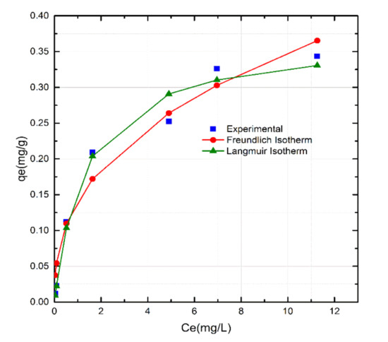 Commonly used two kinetic models, pseudo-first and pseudo-second-order models, were employed to fit the experimental data. Optimized model parameter values are presented in Table 1. The equilibrium capacity as obtained from the fitting procedure employing the pseudo second-order model (qe) very well represented the measured value. The pseudo second-order model best represents the experimental data (R2 = 0.99; Figure 2b), which can be taken as an indicator that chemisorption was the dominant process [43,44].