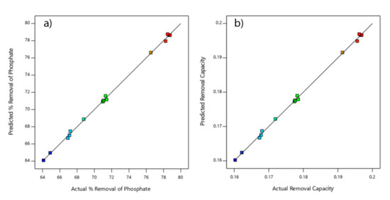 Equations (8) and (9) revealed how the combined variables affect the removal of phosphate from solution onto leftover coal material. The positive values in the equations indicated that the removal of phosphate rises by increasing the effect. The quadratic equation was found as the optimum model to interpret phosphate adsorption onto leftover coal because of the high determination coefficient (R2 = 0.9987 for % removal and R2 = 0.9986 for removal capacity) and low probability value (p-value < 0.0001 both for % removal and removal capacity). A cubic model has higher values of R2 and adjusted R2 but was considered by the software as aliased and can, thus, not be used to interpret the experimental data because of an inadequate number of batch experiments [41]. Adequacy of the model tested and model summary of both % removal and removal capacity are summarized in Tables S2 and S3.