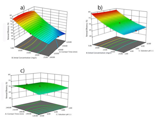 The capability and significance of the quadratic model and factors were analyzed by using analysis of variance (ANOVA). A combination of the Fisher test value (F-value) and probability value (p-value) can verify the signature of the model and the parameters used. F-values of greater than 4 and p-values of less than 0.05 indicate that the model is significant and can be used for accurate prediction of phosphate removal [58]. In this case, A, B, C, AB, AC, A2, B2, C2 are significant model terms. The F-value and p-value of BC (combined effect of initial concentration and solution pH) for % removal were 2.07 and 0.1804 respectively indicating that the model is not significant. The corresponding individual and combined results of each parameter for % removal and removal capacity, q are given in Tables S4 and S5 in the Supplementary Materials.