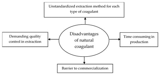Compared to alum, the usage of natural coagulant in the harvesting process is promising due to its non-toxic nature and that it is safe for consumption [31]. Therefore, progressive research on natural coagulant in microalgae harvesting should be done, especially for EPA/DHA dietary microalgae oil. To date, the disadvantages of natural coagulant are mainly due to its feasibility in terms of production time, commercialisation in industrial and quality control. Figure 1 shows the disadvantages of utilising natural coagulant in microalgae harvesting.
