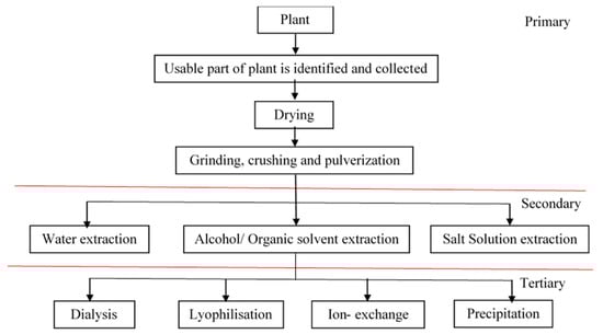 Over the past few years, researches have been conducted on various types of natural coagulants derived from plant wastes and fruit pieces, for instance, Nirmali seeds, Moringa oleifera, Surjana seed, Arabic gum, maize seed, tannin, Cactaceae, etc. had demonstrated significant coagulant capacities [32,33]. Among all, the plant-based coagulant recently received the greatest level of attention is the seed of Moringa oleifera native to Sudan [2]. Research by Vijayaraghawan et al. [34] shows that the water extracted M. oleifera seed has a comparative result with aluminium salt (alum). Moreover, there are standardised and well organised extraction steps in extracting the plant-based coagulant [35]. The general processing steps of the extraction of plant-based coagulants can be categorised into three major stages: primary, secondary and tertiary (Figure 2). Further, there is green extraction technology, for instance, utilisation of salt solvent will increase the extraction efficiency and flocculating activity of peanut seed coagulant as compared to water extraction, which has an improvement of 61% in turbidity removal [36]. Ultimately, it will reduce the cost of extraction and energy used along the harvesting process.