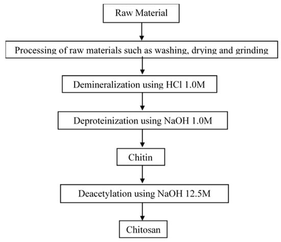 However, chitosan is insoluble in either water or solvent. Thus, diluted acids such as acetic acid and hydrochloric acid are used. When acid is added, the free amino groups are protonated and the biopolymer becomes fully soluble [66]. Most of the preparation techniques of chitosan rely on chemical processes for extracting the protein and removing of inorganic matter. The processes involved extraction by solvent, followed by oxidation of remaining residues [67]. Overall, the extraction of chitosan from raw material includes the following stages; (1) grinding of raw materials (processing), (2) translating the mineral components of raw material into the soluble form (demineralisation), (3) removing the protein fractions (deproteinisation) and (4) deacetylating of chitin in obtaining the chitosan (Figure 3).
