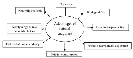However, the emerging usage of plant-based coagulant has achieved higher harvesting efficiency compared with chemical coagulant and there are reviews on their effectiveness and relevant coagulating mechanisms for the treatment of wastewater and microalgae harvesting [120,122,123]. To illustrate, the plant-based coagulant could be applied on microalgae harvesting at relatively low cost [124]. Compared to alum, the natural coagulant is deemed to be environmentally friendly because it is extracted from plants, animal or microbial and usually existed in non-toxic form [125]. The water soluble active compound in natural coagulant will be removed after several cycle of kidney filtration, leaving less possibility of producing toxicity in the body [126]. In view of sludge production after the harvesting process, natural coagulant does not produce suspended alum residual and indeed produces less organic residual due to its biodegradability. In contrast, alum requires chemical reaction to break down and will not decompose naturally. In a specific type of microalgae harvesting, for instance, extraction of DHA rich microalgae oil as a dietary supplement, natural coagulant appears to be the best option as it harvests a higher amount of microalgae biomass compared to alum and at the same time, it is safe for consumption. Thus, it will not pose any health concern even there is residual remained in algae biomass. The natural coagulant is proven to achieve higher flocculating activity in comparison to alum and their performance is shown in Table 3 and Table 4. In addition, by utilising the natural coagulants, it reduces the alum dependency and ultimately achieves sustainability in the microalgae-based biofuel production industry as well as various fields, including wastewater treatment and medical to name a few. Figure 4 shows the advantages of natural coagulant in microalgae harvesting.