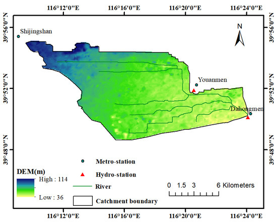 The Dahongmen catchment is a typical urbanized area in Beijing, PRC, with a high population density and heavily built-up underlying surface. The catchment covers an area of approximately 131.49 km2 and is located upstream of the Liangshui River basin in Beijing, between 39°48’–39°55’ N and 116°90’–116°24’ E. In the catchment, the terrain exhibits a downward trend from the western mountains to the eastern plains. The annual average precipitation is 522.4 mm, and 80% of the precipitation occurs during the period from June to September. The river systems and hydro-meteorological stations of the Dahongmen catchment are shown in Figure 1.