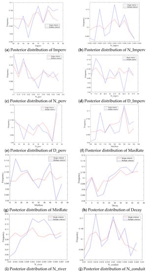 We can obtain the posterior probability distributions of the SWMM parameters from the behavioral parameter sets listed in Table 2. The posterior probability distributions from the single criterion (NSE) and GLUE-TOPSIS are shown in Figure 3.