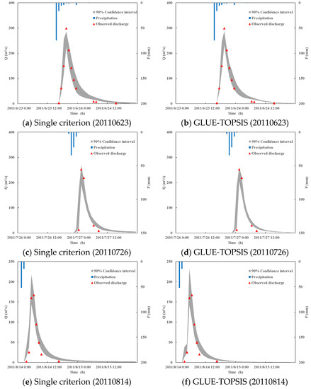 From the simulation results of the median GLUE estimates in Table 4, it can be seen that under the GLUE-TOPSIS method, the simulation results of NSE, VB are significantly improved compared with the single criterion method, although the VB of 20110623 has a slight increase. The median estimates improved, with an increase of the NSE by 1.6% in the calibration period, and by 10.0% in the validation period. However, the cost criteria PB increased by 0.010 during the calibration period, from the perspective of single field precipitation, the PB of the 20110814 precipitation and the 20120624 precipitation have increased, indicating that the flood peak flow simulation effect is poor. And the benefit criteria R decreased by 0.078.