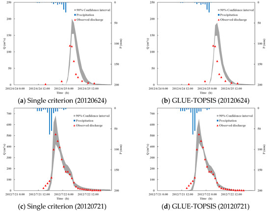 As shown in Figure 4 and Figure 5, the widths of the uncertainty bound from GLUE-TOPSIS method obviously narrower than those from single criterion method, particularly for the flood peak area and drop section of the discharge curve. Most of the observations fell within the 90% confidence interval, except rainstorm 20120624, which is the smallest storm and may influenced by the strobe operation. However, SWMM model show high performance in rainstorm 20120721, which is one of the most disastrous rainstorms in history.