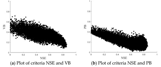 The uncertainties of urban hydrological models have been addressed by several researches [45,46,47,48]. Most researches used single objective function such as NSE or VB as evaluation index [45,46]. As shown in the Figure 6a,b, we found that VB and PB still involved large uncertainties when the NSE was higher than 0.8. This means that a high NSE value can still lead to the poor simulation of the flow volume and flood peak.