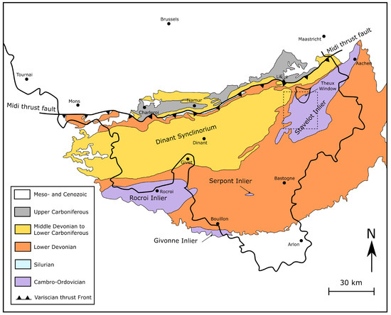 The region is dominated by Palaeozoic rocks of the Rhenohercynian deformation zone that extends through Germany and Belgium, forming a fold-and-thrust belt, related to the Variscan orogeny (460 to 430 Myr) [40]. In the south eastern part of Belgium is found the Ardennes allochton, consisting of a Cambro-Silurian basement, mainly composed of dark clay and siltstone (evolving to slates in some zones), alternating with quartzites and quartzophyllads beds with thicknesses ranging from a few millimetres to several meters. The basement was reworked during the Caledonian orogeny (450 Myr) and is unconformably overlain by Devono-Carboniferous sandstones and limestones [41]. Basement rocks and the Devono-Carboniferous cover were then deformed during the Variscan orogeny (350 Myr) [42,43]. This deformation resulted in the NE-SW Ardenne anticlinorium, with outcropping Caledonian bedrock inliers located on anticline crests (Figure 1).