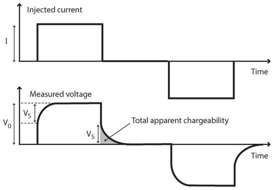 The TDIP method provides information about the electrical capacitive properties of the underground (i.e., its ability to temporarily store electrical charges). When an electrical current is injected into the subsurface, several polarization processes can occur due to the movement of electrical charges. These mechanisms imply a redistribution of charges along interfaces, creating a secondary electrical field which itself results in a secondary voltage (Figure 6) that can be measured. When the injected current is cut-off, follows a decay curve as the charges progressively return to electrical equilibrium. The characteristics of this decay curve are used to compute an apparent chargeability value, which reflects the magnitude of the polarization processes. To do so, the decaying signal is generally integrated over n time windows, and the apparent chargeability M is calculated following Equation (2), in which is the secondary voltage decaying with time, is the voltage used for calculating the DC resistivity and and are the open and close times of the time window over which the signal is integrated [48,49].