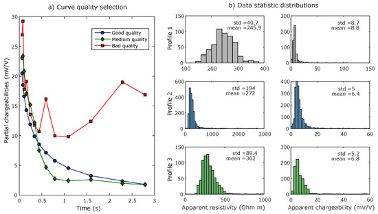 A disadvantage of using metallic electrodes for current injection and voltage measurements can be the increased risk of occurrence of parasitic effects linked to electrode polarization phenomena that may affect the shape of the secondary voltage decay [56]. To account for this risk and filter our data sets accordingly, the apparent chargeability data associated with noisy decaying curves were disregarded. Each curve was visually inspected and rejected if the global curvature did show an expected smoothly decreasing shape. Figure 7a represents the limit case in which the data was accepted while Figure 7b) proposes a histogram based representation of the data statistic distributions. Moreover, negative chargeability curves were removed from the data set because most of them presented a significantly noisy shape and keeping this data systematically resulted in a significant increase of the inverted models RMS error (sometimes above 10%). As a result of those data selection criteria, a maximum of 13% of the data set was removed for all profiles.