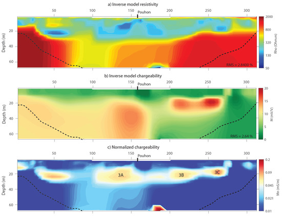 Resistivity, chargeability and normalized chargeability sections are presented for each profile. On each section, a black dashed line represents the limit below which the depth of investigation (DOI) index, as defined by Oldenburg et al. (1999), exceeds a value of 0.2, which is considered as the threshold value above which the associated inversion results are uncertain [59]. The sensitivity values, which can also inform us on the confidence that can be attributed to the results are displayed in Appendix A (Figure A1). On each normalized chargeability section, the main anomalies are labelled with a number corresponding to the profile, and a letter for later reference in the paper.