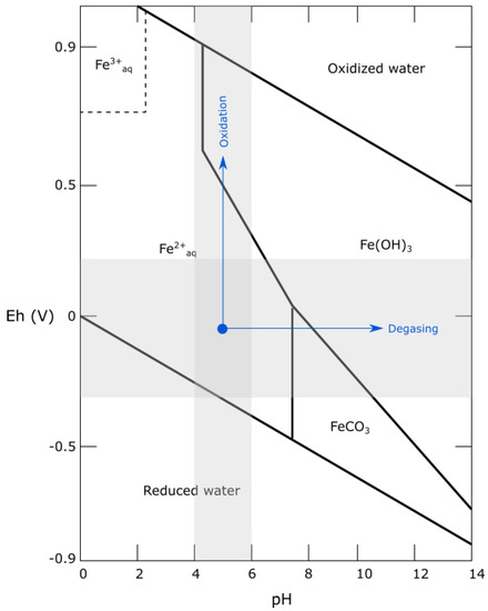 Under the pH conditions (between 4 and 6 pH units) and Eh conditions (between −0.3 and +0.2 V) prevailing in these areas, iron is almost exclusively found under the form Fe. As groundwater upflows and enters a more oxidizing zone, Fe rapidly oxidizes to Fe, as detailed in Equation (4). It precipitates under the hydroxide form (Fe(OH), mostly goethite), as shown in Figure 11. The degassing of CO at the atmospheric pressure further leads to the formation of Fe(OH) as the pH increases.