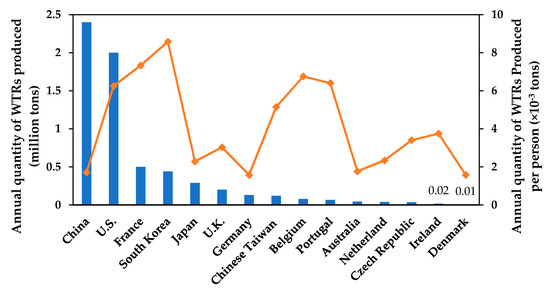 WTR production from drinking water treatment is generally estimated to represent 1%–3% in volume of the raw water used during the treatment process [3]. However, specific data on the global or regional level showed that the WTRs generation are seldom available because the local authorities usually publish the waste statistics in a broad category instead of specifying each waste type, e.g., WTRs were always wrongly associated with wastewater treatment plant sludge (sewerage sludge) [1]. Thus, it is difficult to retrieve the exact WTRs generation of a country or region and only 15 countries’ WTRs annual generation data were found in the literature [1,4,5,6]. As shown in Figure 1, the WTRs generation in China is the largest at 2.3 million tons per year, however, the largest quantity of annual WTRs generation per person was found in South Korea. By contrast, Denmark has the least WTRs generation of 10,000 tons/year as well as the quantity of annual WTRs generation per person among the fifteen countries. The sludge disposal cost in the Netherlands stands at a huge sum of USD 37–50 million per year, and USD 6.2 million per year in Australia. It was also estimated that the alum sludge disposal cost in Ireland will be doubled by the end of the next decade from the present assessment of 15,000 to 18,000 tons/year of the dried solids [7,8,9,10].