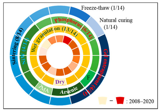 Figure 2 illustrated the classification of WTRs granulation. From the outermost to the inner annulus, they were classified by pelleting technique, target pollutant, granulation method and reported years. It can be seen that, among the 14 investigations in the literature, 8 studies employed sintering technology, 4 studies employed gel entrapment method, and 2 studies employed novel methods i.e., freeze–thaw process, and natural curing.