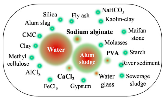 Granulation and pelleting always require binders to aggregate particles. Various binders including organic and inorganic binders were also summarized in Figure 3. In literature, the frequently used materials were sodium alginate, PVA, water glass, AlCl3, CMC, NaOH, methyl cellulose, molasses. Wu et al. [27] suggested that AlCl3 was the optimum binder compared to other binders such as Na2SiO3, PVA, CMC. Starch was the best pore-forming agent compared to NaHCO3, while the optimum dosage was 4%. It can be concluded from the various studies that the amounts of binders in the pelleting and granulation process could influence the strength and adsorption capacity of adsorbent. The amounts of moisture in the pellets could change the pore structure during the thermal treatment [16,18]. Moreover, various studies also have proven that heavy metals are properly stabilized in WTRs ceramsite and cannot be easily released into the environment again to cause secondary pollution, which is in line with the sustainable development and can be safely reused [22,38].