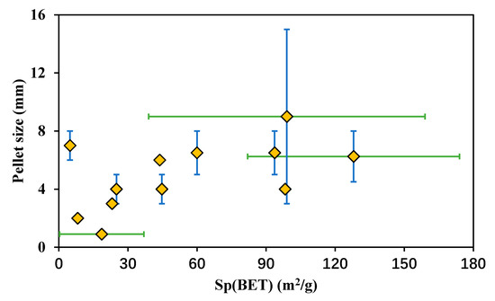 The characteristics, e.g., compositional and structural variations of granular WTRs obtained in the literature, were attributed to many factors, such as sintering temperature, sintering time, kinds of binders and ratios of materials. Figure 4 shows the range of specific surface area and pellet size of granular WTRs in the literature. In general, the calcination process could create a rough surface and increase the surface area and result in enhanced adsorption kinetics [27,28].