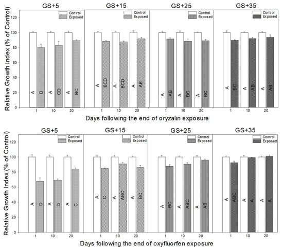 Relative growth index of H. paniculata ‘Limelight’ in response oryzalin (8 mg/L; top) or oxyfluorfen (0.02 mg/L; bottom) following 10 days of herbicide exposure at various stages of plant growth. Growth stage (GS) GS +5 received herbicide exposure five days after initiation of growth, GS +15 received herbicide exposure 15 days after initiation of growth, GS +25 received herbicide exposure 25 days after initiation of growth, and GS +35 received herbicide exposure 35 days after initiation of growth. Standard errors of the means are denoted by vertical ‘T’ lines. Mean separations for each herbicide were carried out using Tukey’s honest significant difference post-hoc mean separation test. Means within each herbicide across all growth stages that are followed by the same letters are not significantly different at p = 0.05.