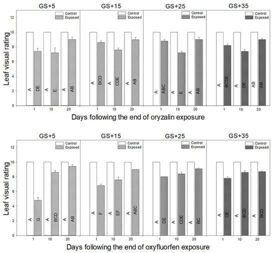 Leaf visual rating of H. paniculata ‘Limelight’ in response oryzalin (8 mg/L; top) or oxyfluorfen (0.02 mg/L; bottom) following 10 days of herbicide exposure at various stages of plant growth. Growth stage (GS) GS +5 received herbicide exposure five days after initiation of growth, GS +15 received herbicide exposure 15 days after initiation of growth, GS +25 received herbicide exposure 25 days after initiation of growth, and GS +35 received herbicide exposure 35 days after initiation of growth. Standard errors of the means are denoted by vertical ‘T’ lines. Mean separations for each herbicide were carried out using Tukey’s HSD post-hoc mean separation test. Means within each herbicide across all growth stages that are followed by the same letters are not significantly different at p = 0.05.