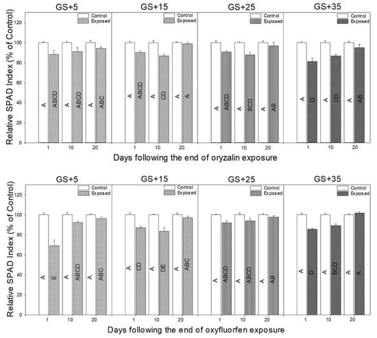 Exposure to both herbicides reduced the SPAD chlorophyll index at various growth stages. The SPAD index was reduced on plants across all growth stages, except GS +5, on 10th day after the end of oryzalin exposure. For oxyfluorfen exposure, the SPAD index was reduced on all growth stages, except GS +25 on first day after the end of the exposure. However, on the 20th day after the end of both herbicide exposure, the SPAD index of exposed plants was similar to control plants regardless of when plants were exposed to herbicide (Figure 4).