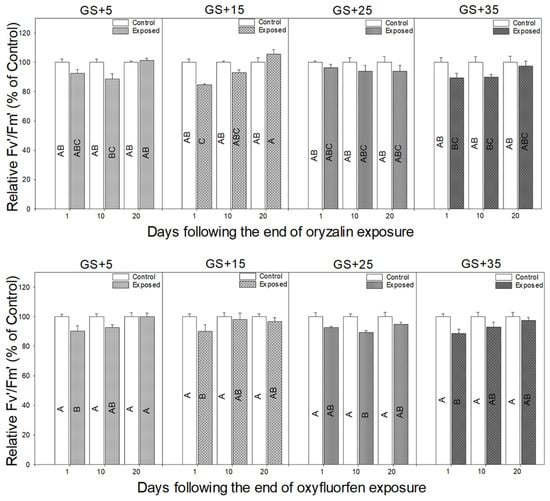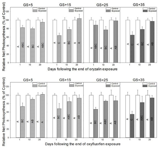 Physiological measurements, such as A and Fv’/Fm’, may be used as early indicators of herbicide damage [,]. In our study, both A and fluorescence parameters had a faster and greater response to herbicide exposure compared to visual injury and growth, at later growth stages from GS +15 to GS +35, and GI and leaf visual rating had a greater response at early growth stage i.e., GS +5. However, Fv’/Fm’ for oryzalin exposure was not as responsive as A. For oryzalin, leaf visual rating was lowest 10 days after the end of the exposure, but A and Fv’/Fm’ had already started to recover. The increase in A and Fv’/Fm’ was followed by visual leaf recovery evident on the 20th day after the end of oryzalin exposure. Thus, leaf damage by herbicides, such as oryzalin, that do not produce immediate visible damage can be identified quickly by using physiological tools, such as A, and those tools can be used as early indicators for herbicide damage, preferably at later growth stages when visible damage may take some time to appear. In contrast to our results, exposure to oryzalin did not reduce A for dwarf gardenia (Gardenia jasminoides ‘Radicans’ Thunb.) and fountain grass (Pennisetum rupelli Steud.) probably because the concentration used was eight times lower compared to ours []. As discussed earlier, recovery from injury associated with oxyfluorfen exposure was faster than recovery from oryzalin and was obvious during physiological evaluations. Photosynthesis and Fv’/Fm’ accurately and clearly reflected oxyfluorfen damage across all growth stages (expect GS +25 for Fv’/Fm’), therefore they can provide quick identification of oxyfluorfen injury. Both A and Fv’/Fm’ completely recovered from herbicide damage as early as 10 days after the end of exposure and was followed by morphological recovery. Thus, physiological tools can also be efficiently applied to detect herbicide recovery in addition to herbicide damage. Physiological recovery of plants from oryzalin exposure was slower compared to oxyfluorfen. Physiological parameters, such as A and Fv’/Fm’, were either the same or lower on 10th day after the end of oryzalin exposure compared to a day after the end of oryzalin exposure, expect on GS +15 for Fv’/Fm’. Overall, plants exposed to oryzalin took somewhere between 10–20 days for A and Fv’/Fm’ to completely recover. However, this was still quicker than recovery of GI and visible symptoms.