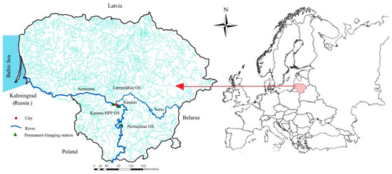 Lithuania is a low-lying country; about 90% of its area lies below 170 m elevation above sea level, with hills no higher than 290 m. The Nemunas is the largest lowland river in Lithuania, with a low channel slope averaging to 0.0002, flowing through Kaunas city to the Baltic Sea (Figure 1). The catchment area is approximately 100,000 km2, with an average discharge of 632 m3/s.