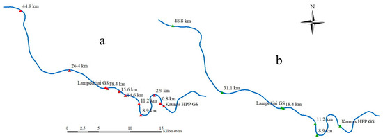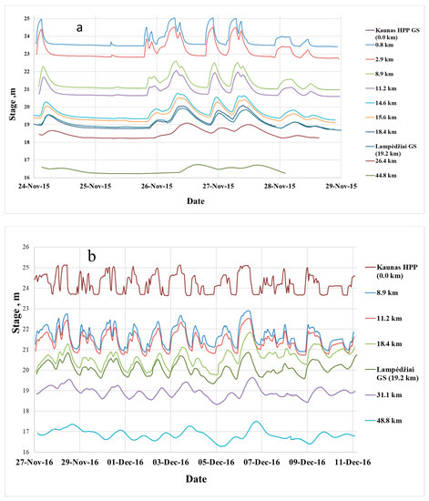 Stage measurements along the Nemunas River downstream from Kaunas HPP: (a) Low flow period (return period 20 years), (b) mean flow period (return period 2 years).