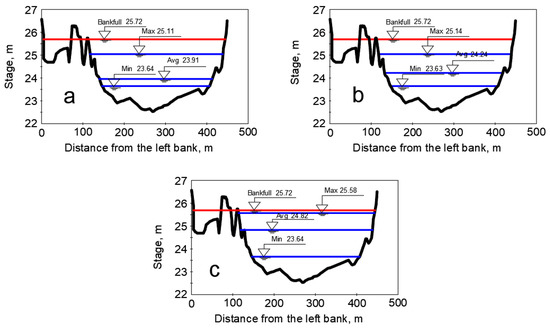Three river channel situations showing range of stored water in terms of stage during investigated period (Kaunas HPP GS): (a) dry year (2015), low river channel water storage; (b) average year (2016), moderate river channel water storage; (c) wet year (1988), high river channel water storage (red line—bankfull water storage level, blue lines—maximum, average and minimum water storage levels).