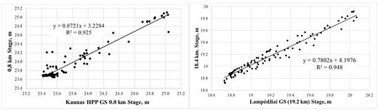 The coefficient of determination (R2) between the river stage data pertaining to Kaunas HPP gauging station (0.0 km) and temporary stage measurement site 0.8 km (results were shifted along the river slope at Kaunas HPP) is 0.925, and the NSE coefficient is 0.900. The stage data determination coefficient between Lampėdžiai gauging station (19.2 km) and temporary stage measurement site 18.4 km is 0.948, and the NSE coefficient is 0.917. The relationship between different sources of data is sufficiently high, therefore stage data from data loggers at temporary stage measurement sites were used in this study for further evaluation.