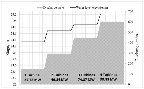 The impact of hydropower operations on rivers can cause stranding of fish or other water organisms during rapid drawdown, which can be characterized by so-called dewatered areas occurring in the varial zone of a stream channel [29]. To account for this negative phenomenon, hydrodynamic modelling was conducted in the Kaunas HPP [30]. Results showed that dewatered areas expanded with an increasing number of operating turbines. When this HPP released water from the base flow of 126 m3/s (one turbine) to 596 m3/s (four turbines), dewatered areas increased to 5.7 ha/km, or 33%, compared with the former case.