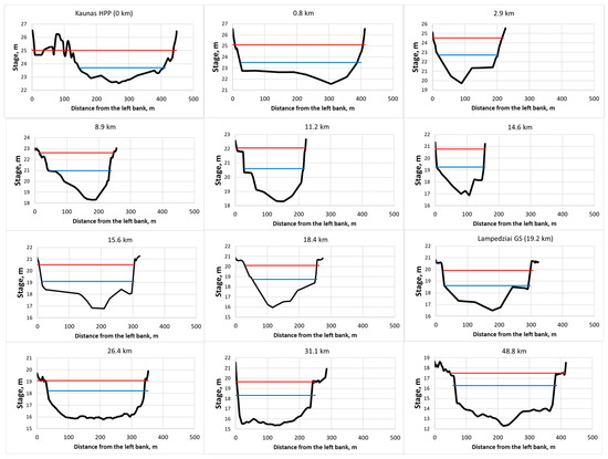 Cross-sections of Nemunas River channel at temporary stage measurement sites and gauging stations in 2015. Two last cross-sections, 31.1 and 48.8 km distance from Kaunas HPP, were taken in 2016. Red lines show maximum river stage, blue lines, minimum stage.