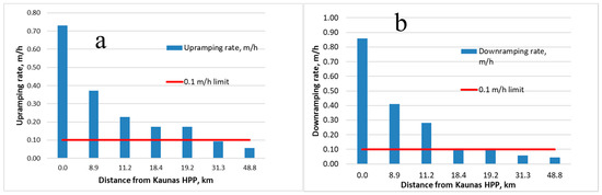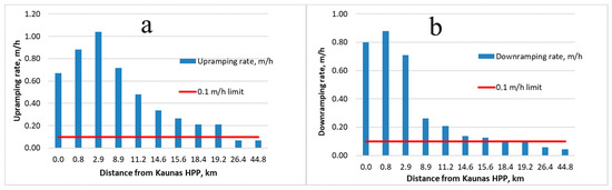 Dynamics of stage fluctuations downstream from Kaunas HPP during average flow period: (a) upramping; (b) downramping. Red line: stage fluctuation limit assigned for natural flowing rivers (0.1 m/h).