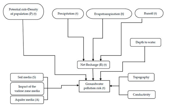 Groundwater vulnerability and pollution risk are strongly dependent on climate [16]. As stated by Li and Merchant [17], a warming climate, for example, could alter the vulnerability of shallow aquifers by affecting depth of the water table and recharge [18,19,20]. Ducci [21] showed that patterns of regional groundwater pollution vulnerability vary between drought, average, and wet periods. In this regard, it is important to introduce the time component in the assessment of groundwater vulnerability and pollution risk.